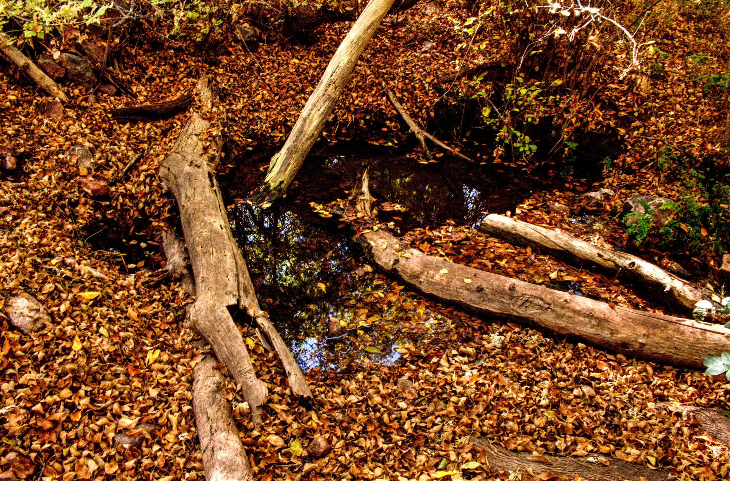 Logs in water, leaves splashed around with brilliant reflections of scene above.
