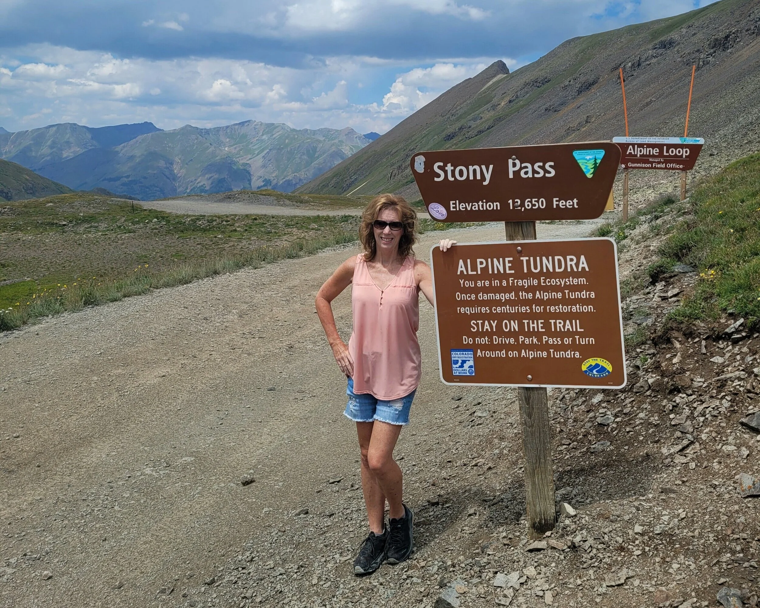 We stepped out of the Bronco, with no umbrella, took deep breaths of the clean, cool and moist air. Well, I did, and believe me, it was better than smelling the dust from below. Camera in tow, I took photos, careful to wipe the camera lens and protect the camera as I did not want water to damage it. We saw the sign that marked the top of the pass, Stony Pass, and my dear husband took a photo of me by it, indicating we were there.